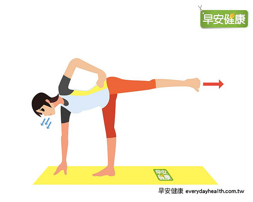 5. 保持这个姿势呼吸5~10次后,一边吐气一边放下左脚并回到2的姿势,换边再做一次即可。