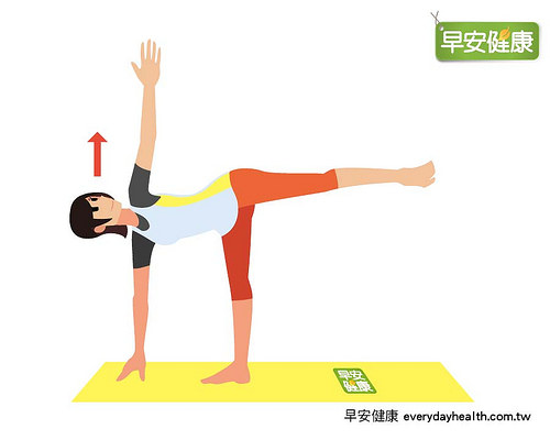 4. 以右手右脚为身体轴心,将身体往上转开并抬起左手向上伸展,让左腰及视线都面向天花板。