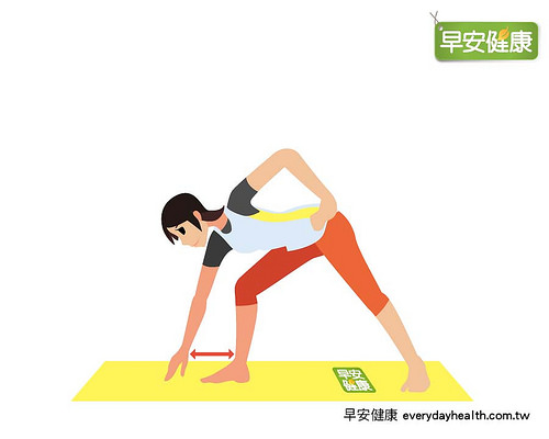 2. 将左手插腰、右手放在右脚脚尖前方20公分处,手指摸地或瑜珈砖。
