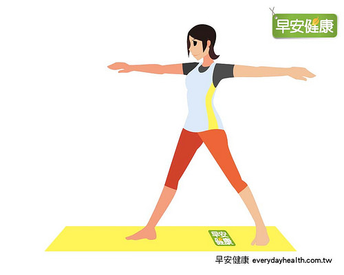 1. 将双脚打开呈现肩膀2.5倍宽,左脚脚尖面向前方而右脚脚尖打横。同时将双手伸直。