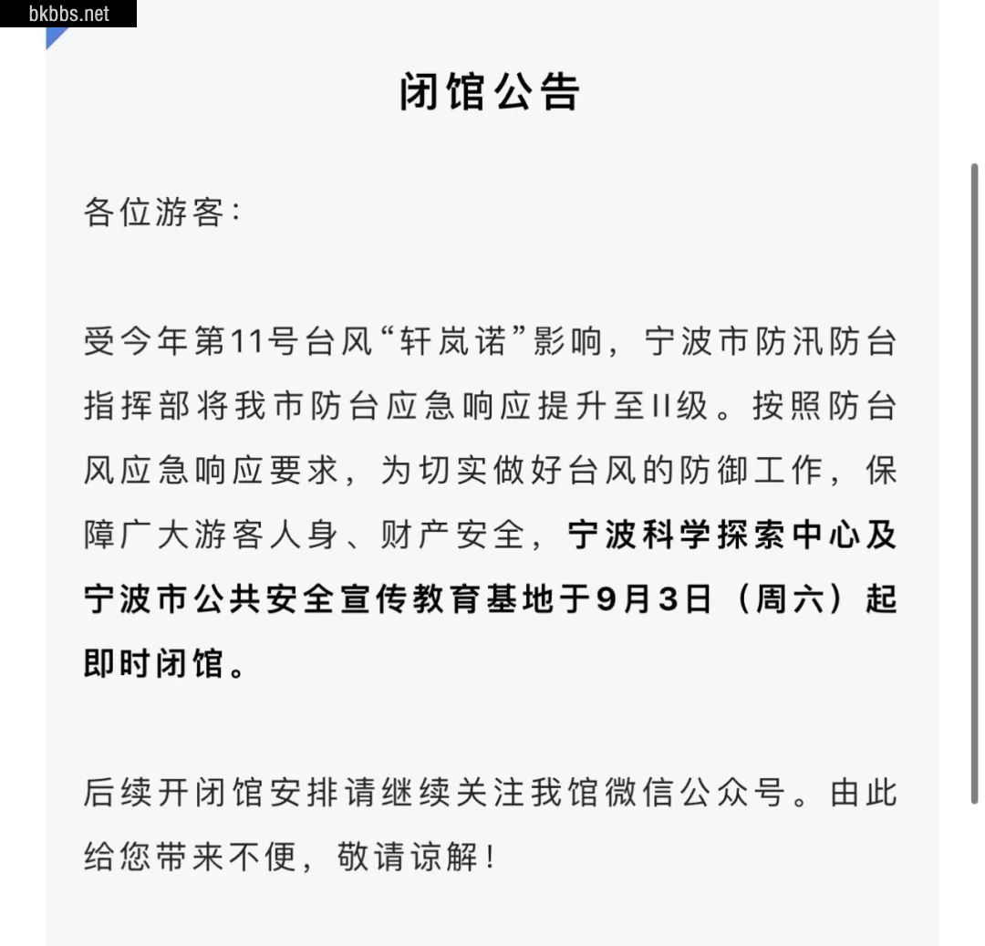 记者了解到,继9月2日(截至下午6点数据)宁波市以涉海、涉山、涉水为主的33家旅游景区闭园后,9月3日下午开始,其余景区,包括天一阁博物院、慈城古县城、鸣鹤古镇及五磊山景区、中国海影城等也陆续暂停对外开放。