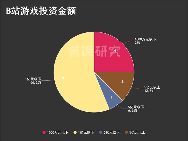 可以看到,B站在游戏领域的投资也以千万元级的大额投资为主,但过亿的较腾讯(53次)、网易(11次)明显更少。