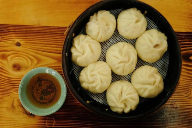 蒸好后的小笼包外皮柔中带劲,肉馅的汁水早浸到外皮的气孔里,咬开的瞬间就得猛吸一口,否则汤汁会跑了出来。再把小笼包往玫瑰醋和桐乡辣酱的蘸料里浸一下,有了调料的加持后,更能凸显出小笼包的鲜美,多层的风味直接在嘴巴里绽开。