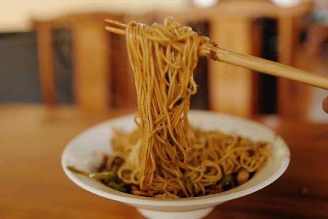 吃干挑面时,要不断将面条高高挑起拌匀,让酱汁挂在每寸面条上。呲溜一口下去,酱汁的存在立刻让面条变得活色生香了起来,咸鲜中又带着一丝丝甜味,即使浇头只是很简单的咸菜肉丝都让人欲罢不能。