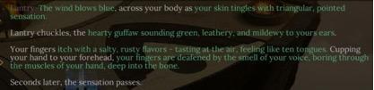 在这一段里,玩家角色首先通过触感感受到了颜色(也就是蓝色的风),然后突然间,又听到了绿色的哄笑声。对手指的描述也一样不知所谓。手指先有了味觉,然后又能听,最后甚至还能闻——也就是说,它们也能尝出最初提到的,空气中带着的颜色。整个段落没有任何连续性,没表达出任何有意义的内容,完全不知要表达什么。事实上,这个段落中提及的意象是可以做些文章的。代表蓝色的“blue”这个词可以用来指“寒冷”,然后这就可以和后面皮肤感受到的刺痛结合起来,因为这轻微的刺痛可以解释为因为寒冷而起了鸡皮疙瘩。