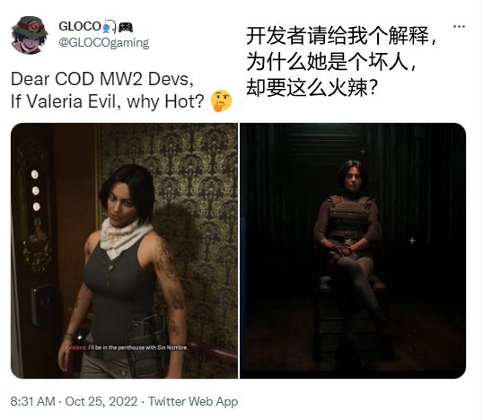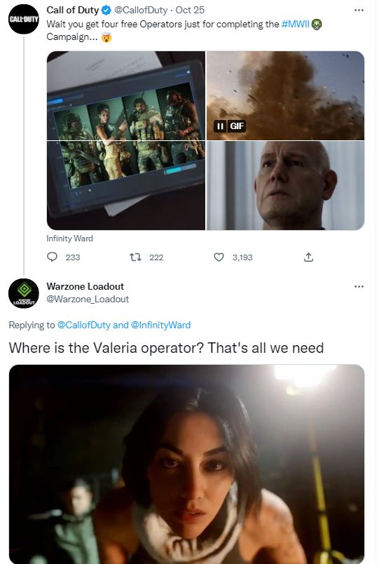 考虑到瓦莱瑞亚出场时间实在有些短,玩家们对没能在剧情模式中和美女有过多互动而感到不悦,认为本来就没让玩家心满意足的COD官方应该从善如流,尽快让她进入多人模式中,最好是以探员的形式,让玩家们能够获得和使用。有人特意在COD官方账号下发起这项提议,得到了许多玩家的支持。