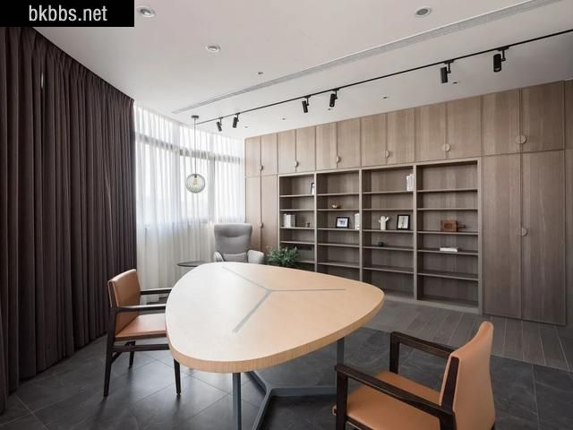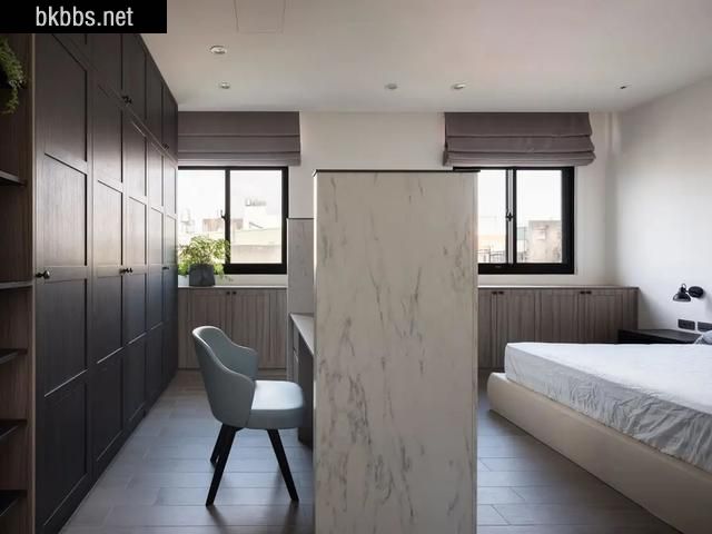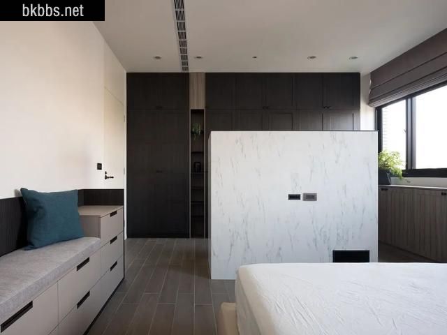 ▲卧室空间面积稍大,在中间装一个矮墙隔出一个工作台,在工作台后定制一排的衣柜,整个卧室空间显得实用优雅而现代。
