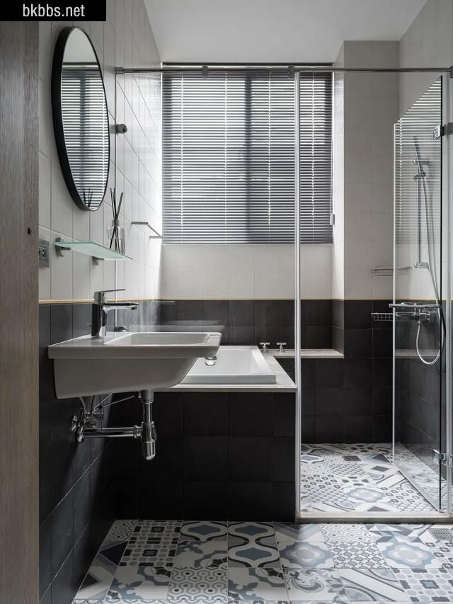 ▲卫生间以花砖地面+深色墙脚砖+米白色墙身墙砖的搭配,干湿分离基础,还在淋浴房内加入浴缸,为主人提供了一个实用多样的卫浴体验。