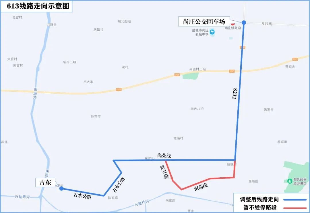 调整后走向:尚庄公交回车场、S232、岗荣线、古水公路、古东。