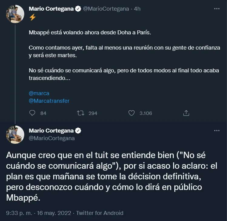 随后他又对这条推特进行了补充说明:“‘至于什么时候官宣并不清楚’的意思我觉得说的很明白,但以防万一我还是再解释清楚点:按计划最终决定会在明天(当地时间周二)做出,但是我不知道姆巴佩会在什么时候,以何种方式,公开宣布自己的决定。”