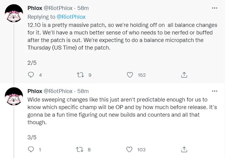05月17日讯 随着赛季的持续进行,新的版本也将随之到来。今日,召唤师峡谷团队的设计师Riot Phlox布了12.10版本前瞻。以下为推特内容(大意):(未经允许禁止转载,搬运截图)