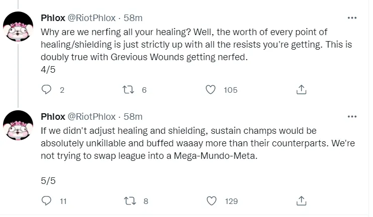 如果我们不调整治疗量以及护盾量的话,续航好的英雄会变得不可击杀,得到的加强要比其他英雄多的多。我们不想让整个游戏变成人人都是回血怪的版本。”