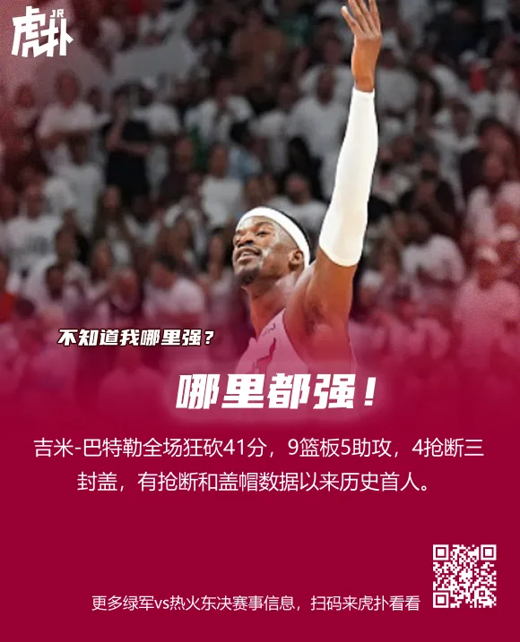 此役,吉米-巴特勒发挥出色,全场19投12中,其中三分球2投0中,罚球18投17中,得到41分9篮板5助攻4抢断3封盖。