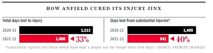 根据英超伤病分析的数据,利物浦本赛季取得了巨大的进步。