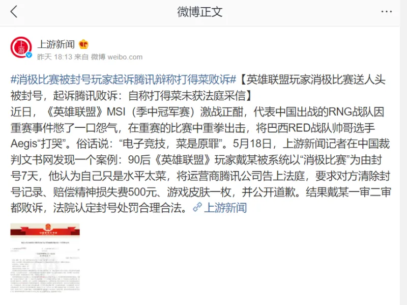 【英雄联盟玩家消极比赛送人头被封号,起诉腾讯败诉:自称打得菜未获法庭采信】