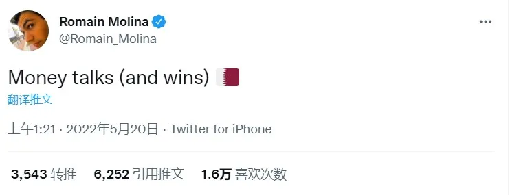 05月20日讯 法国著名的独立调查记者Romain Molina今日在推特发文:金钱万能。同时还在结尾加上了卡塔尔国旗。