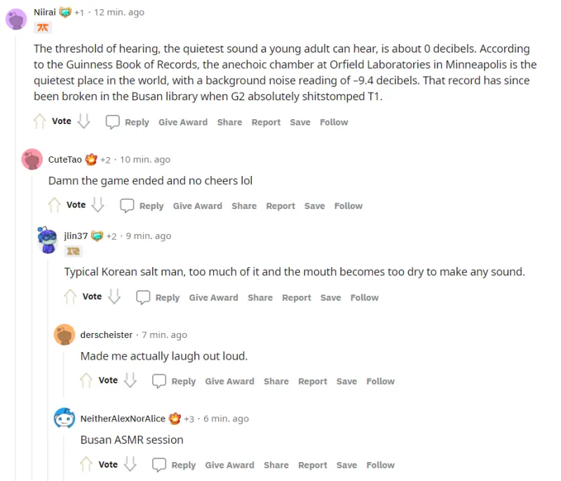 人们能听到的东西是有范围的,一个成年人能听到的最安静的声音约为0分贝。根据吉尼斯纪录,位于美国明尼阿波利斯的奥菲尔德实验室的消声室是世界上最安静的地方,背景噪音读数为 -9.4 分贝。当G2在釜山图书馆暴打T1的时候,这个纪录被打破了。