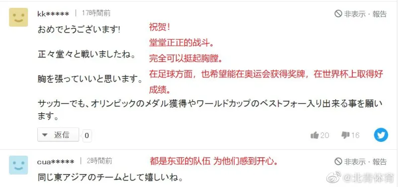 05月21日讯 5月20日,中国田径男子4X100米接力队递补获得东京奥运铜牌,据《北京青年报》报道,有日本网友在评论此事时表示:“在足球方面,也希望能在奥运会获得奖牌,在世界杯上取得好成绩。”