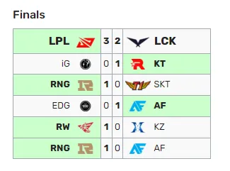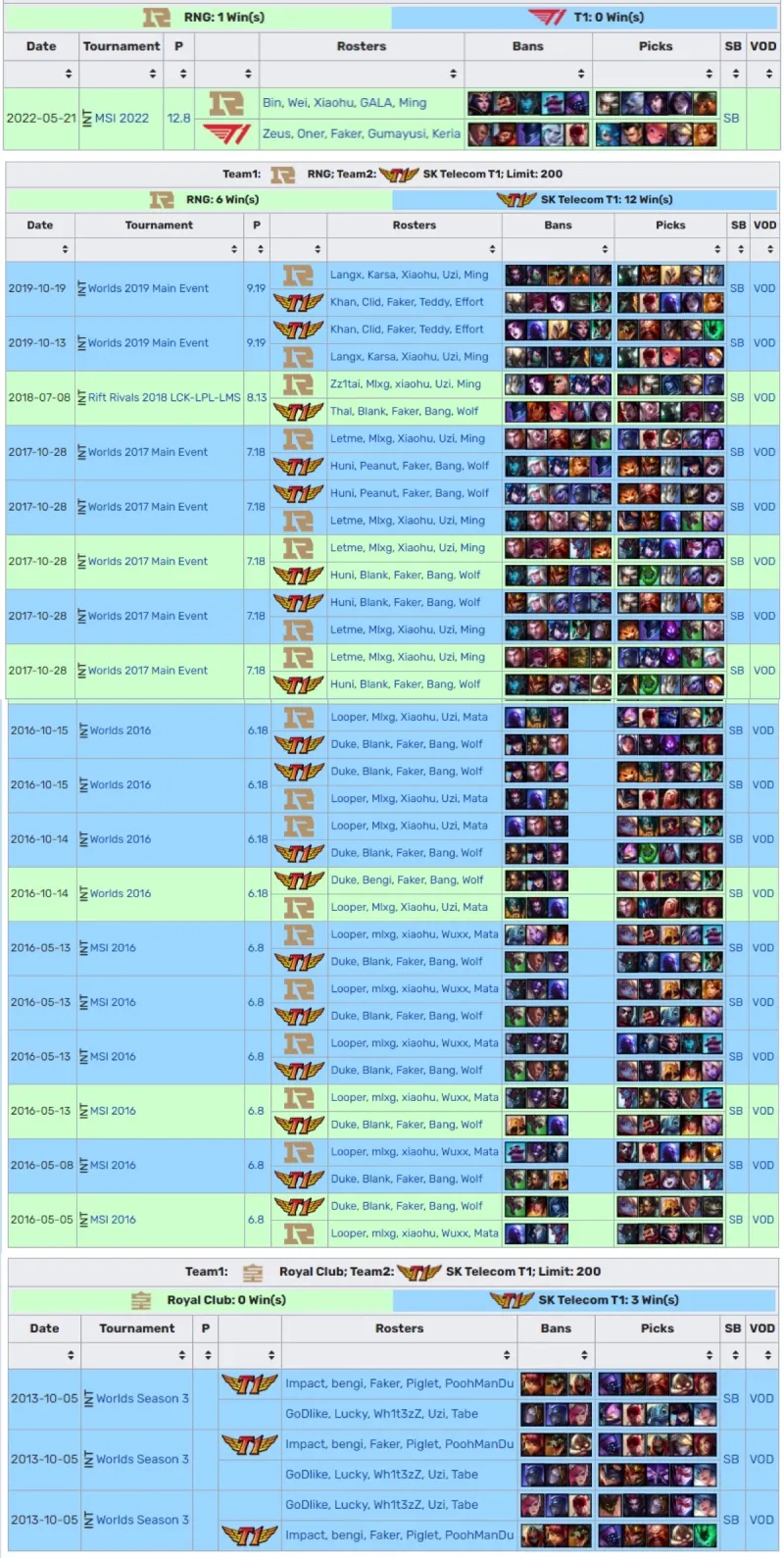 RNG(皇族)和T1(SKT)交手记录如下