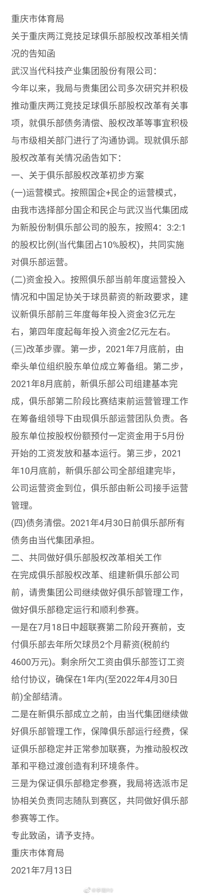 有人说你一个企业投资俱乐部不想玩了为啥想让政府兜底?那是因为之前重庆市体育局就球队的具体运营和股改给过俱乐部具体的指导意见,本报之前的报道里写到过这份文件。