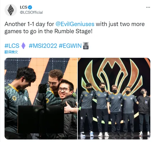 LCS官推:EG又是1-1的一天,他们MSI对抗赛还剩下两场比赛。