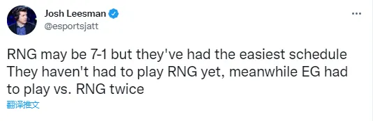 LCS主持人Jatt整活:“虽然RNG的战绩是7胜1负,但他们的赛程是最轻松的,他们还没和RNG打过,而EG已经和RNG打了两次。”