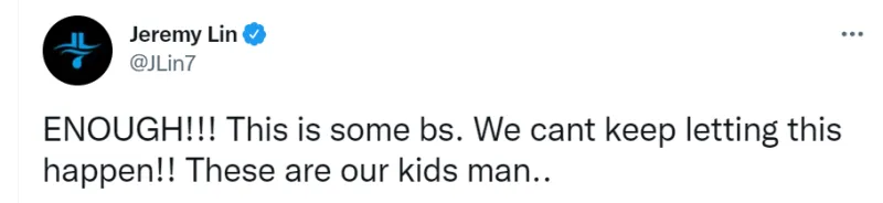 林书豪转发纽约时报推特,附文道:“够了!这太糟糕了,我们不能让这一直发生,这些是我们的孩子啊!”