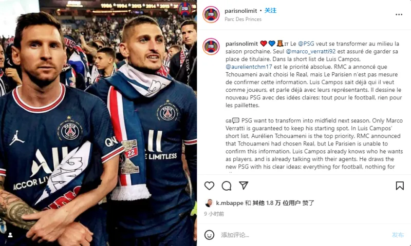05月25日讯 巴黎球迷账号parisnolimit在INS发布了一篇新帖子,帖子中把引进琼阿梅尼视为巴黎的重要任务,而姆巴佩和其他1.8万用户点赞了这篇文章。Q5j拜客生活常识网