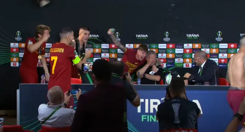 一起嗨!罗马球员冲进新闻发布会现场,与穆里尼奥共同庆祝