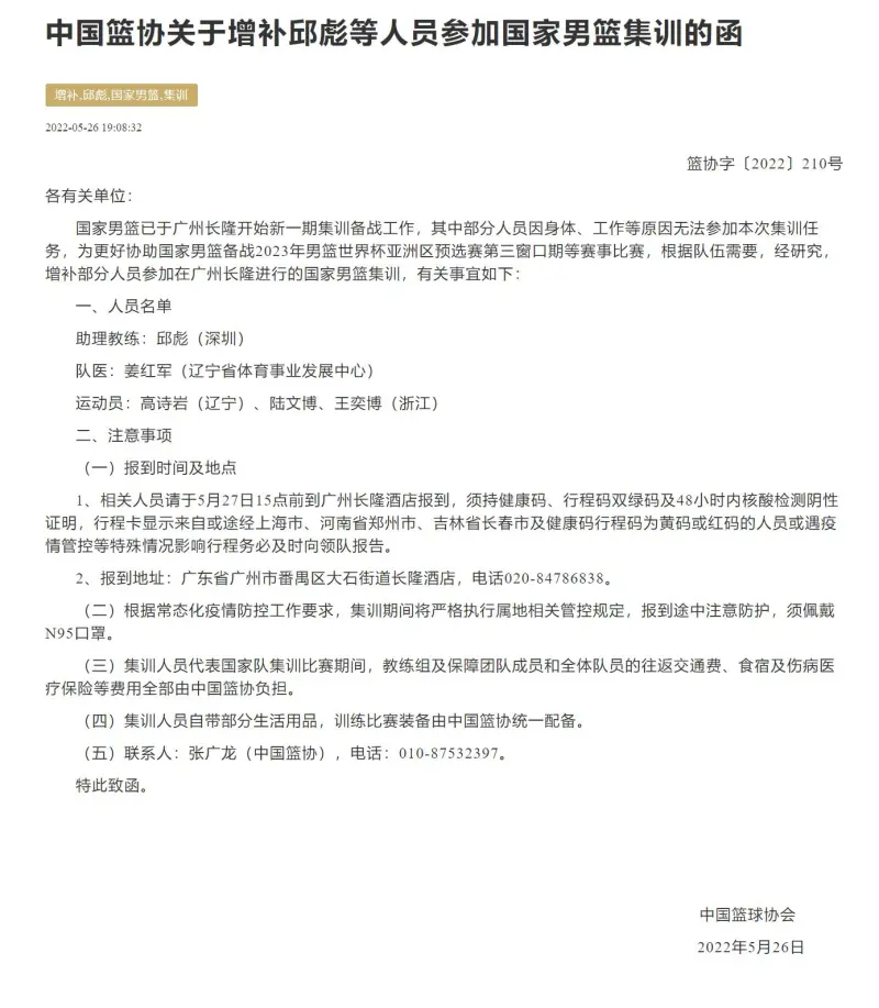 05月26日讯 今日,中国篮球协会官方发文,增补深圳男篮主教练邱彪、辽宁男篮球员高诗岩、浙江男篮球员陆文博、王奕博进入国家男篮集训队。