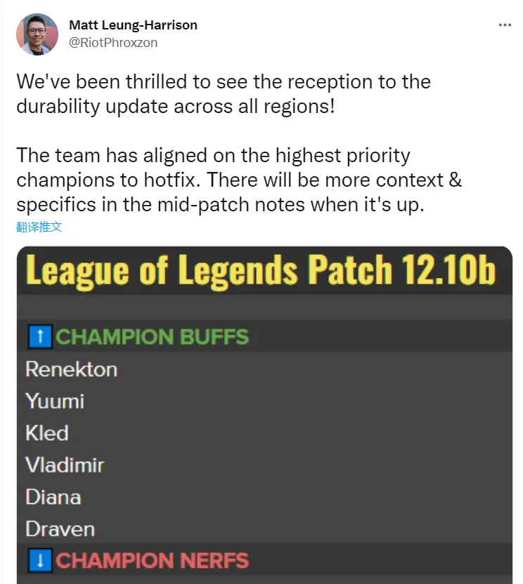 05月27日讯 今日,召唤师峡谷团队的首席设计师RIot Phroxzon公布了12.10b版本的热补丁,以下为推特原文(大意):