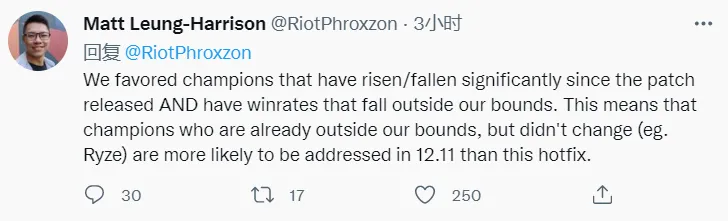 “我们优先修改那些自从版本改动实装以后胜率飙升/暴跌的英雄,以及那些胜率过高或者过低的英雄。这意味着那些胜率已经处于异常位置,但是未得到改动的英雄(比如说瑞兹)会在12.11版本中得到改动,而不是在这次热补丁中。”
