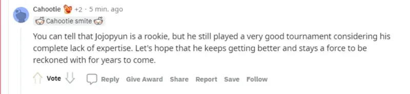 你可以看出来jojopyun是个新人,但是因为他还有很多可以进步的地方,所以这届他还打得不错。希望它能继续变好,然后能在以后的几年内成为不可被忽视的一股力量。