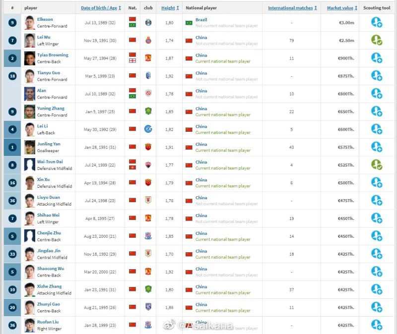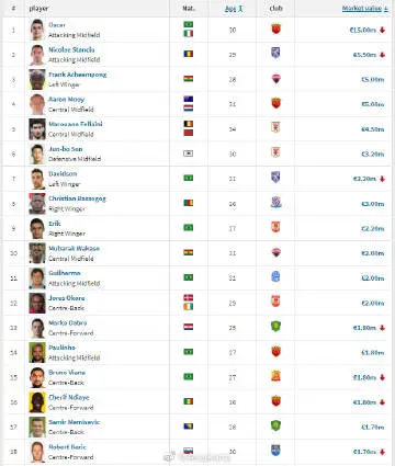 05月28日讯 德转亚洲区管理员朱艺在自己的个人微博上更新了中国球员身价榜前十,艾克森300万欧元位列第一,武磊250万欧排名第二。中超外援身价排名前十中,奥斯卡继续领衔,他的最新身价是1500万欧,武汉三镇外援斯坦丘以550万欧元排名第二。