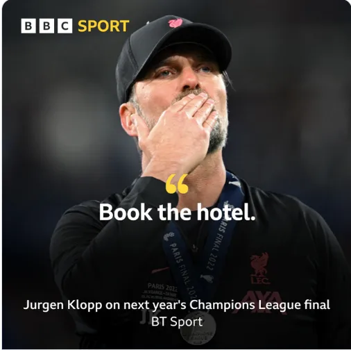下个赛季的欧冠决赛在哪?伊斯坦布尔?订酒店吧。(Where's it next season? Istanbul? Book the hotel.)”