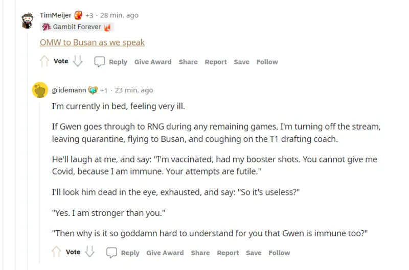如果RNG还能在剩下的比赛中选到格温的话,我就关掉直播,结束隔离,直接飞到釜山,然后对着T1的BP教练咳嗽。
