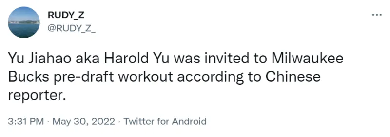 05月30日讯 北京时间今日,据外媒报道,中国球员余嘉豪将参加NBA密尔沃基雄鹿队的选秀前试训。