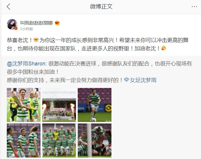 05月30日讯 北京时间5月30日凌晨,苏格兰女足杯决赛,沈梦雨所在的凯尔特人女足通过加时赛3-2战胜格拉斯哥城女足夺得冠军,她本人也获得了个人留洋生涯第二个冠军。赛后,中国女足门将赵丽娜微博发文向她表示了祝贺:期待你能出现在国家队,走进更多人的视野里!加油老沈!