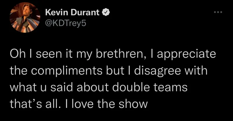 对于格林表示杜兰特不要被片面的言论带动,杜兰特最后回复格林写道:“哦,我看到了,我的兄弟,我很欣赏你的赞美。但我不同意你所说的有关双人包夹的点,仅此而已。我喜欢这个节目。”