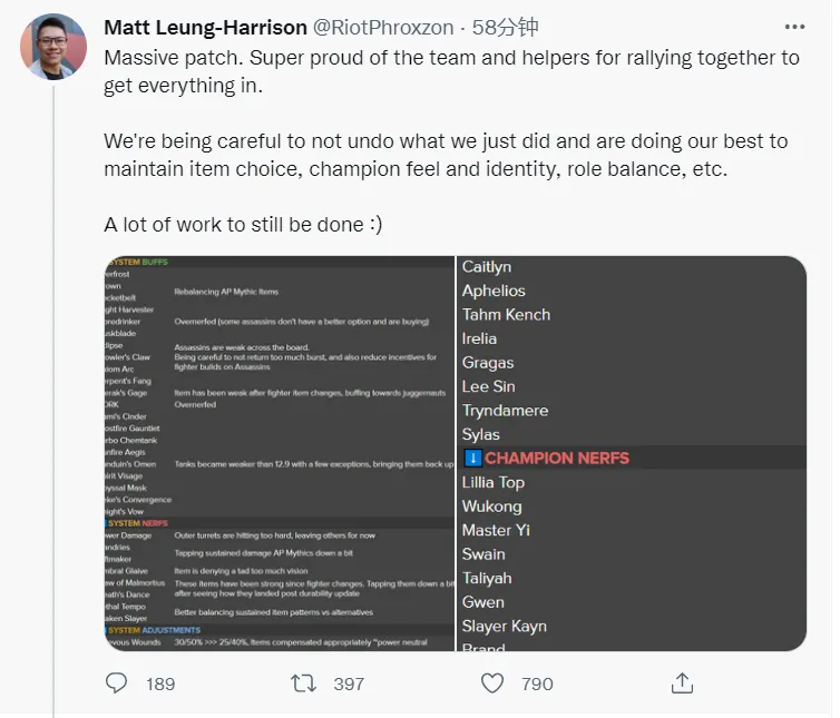 06月01日讯 随着赛季的持续进行,新的版本也将随之到来。今日,召唤师峡谷团队的首席设计师Riot Phroxzon公布了12.11版本改动前瞻。以下为推特内容(大意):(未经允许禁止转载,搬运截图)