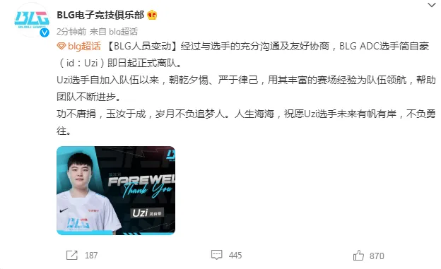 经过与选手的充分沟通及友好协商,BLG ADC选手简自豪(id:Uzi)即日起正式离队。