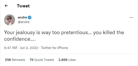 而今日勇士阵中的伊戈达拉也是发布了一条推特,他晒出了一句歌词:“Your jealousy is way too pretentious...you killed the confidence...(你的嫉妒心太过于装腔作势,这使得你失去了自信!)”