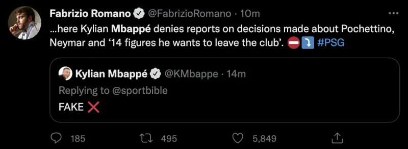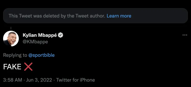 随后姆巴佩通过个人社交账号对此传闻进行了辟谣,称此为假消息。在之后不久,该足球媒体也将该推文删除。