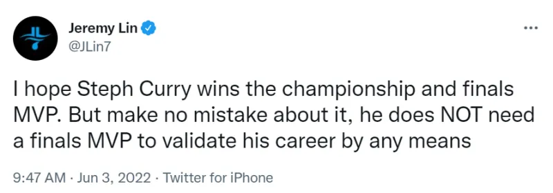林书豪在推特上写道:“我希望库里赢得总冠军和总决赛MVP。但是请不要误会,他不需要以总决赛MVP证明他的职业生涯。”