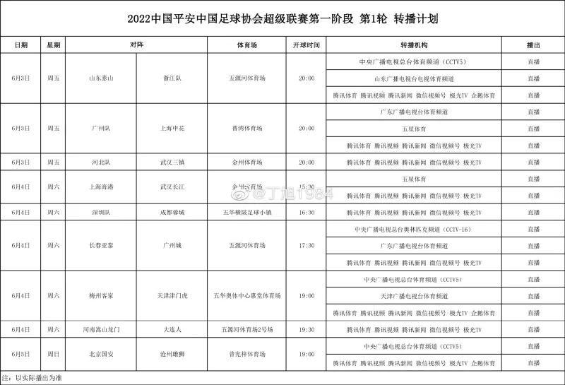 06月03日讯 媒体人丁旭于今日在微博上发布了新赛季中超首轮的转播安排。