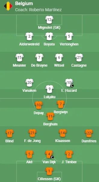 荷兰首发:1-西莱森、5-阿克、4-范迪克、2-廷伯、17-布林德、21-F-德容、14-克拉森、22-邓弗里斯、11-博古伊斯、10-德佩、7-贝尔温