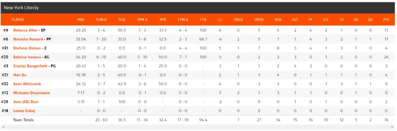 今日讯 北京时间今日,WNBA常规赛继续进行,纽约自由人74-70战胜华盛顿神秘人。