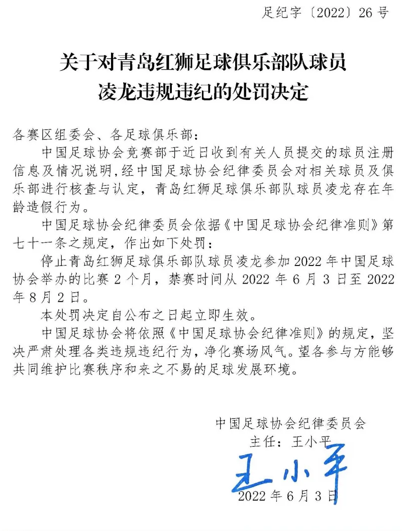 公告一:青岛红狮球员凌龙年龄造假,处以禁赛两个月。