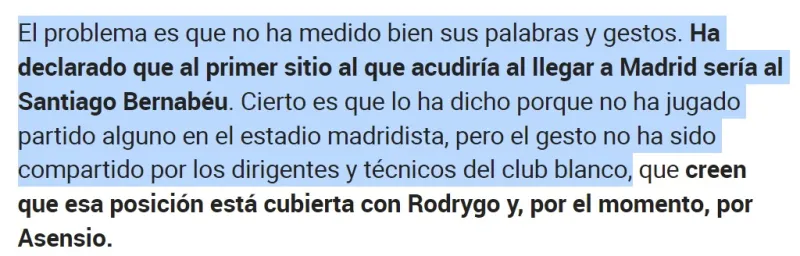 而且另一方面,格纳布里作为一名右边锋,对于皇马来说也并非急需的引援类型,目前皇马的右路同时有阿森西奥,罗德里戈,尤其是罗德里戈,过去一个赛季正在逐渐适应右边锋的位置,这让皇马非常满意。