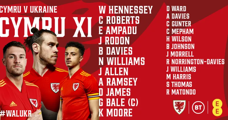 威尔士首发:1-亨内西、3-内科-威廉姆斯、4-本-戴维斯、6-罗登、14-罗伯茨、15-阿姆帕杜、10-拉姆塞、7-乔阿伦、20-丹尼尔-詹姆斯、13-穆尔、11-贝尔;